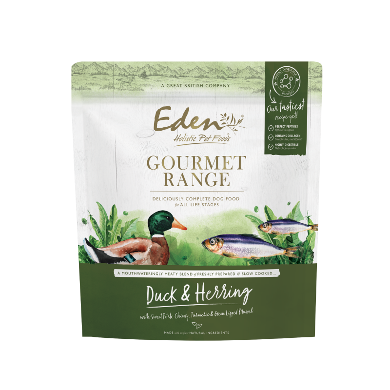 Highly nutritious and tastes delicious! A delectable pairing of Duck & Herring in a highly digestible kibble. Rich in Omega-6 supporting skin and coat health, as well as cellular and immune function. Our innovative and luxury Duck & Herring recipe, is formulated with highly digestible protein and collagen, to support dogs of all life stages, to thrive and enjoy an enhanced eating experience.
